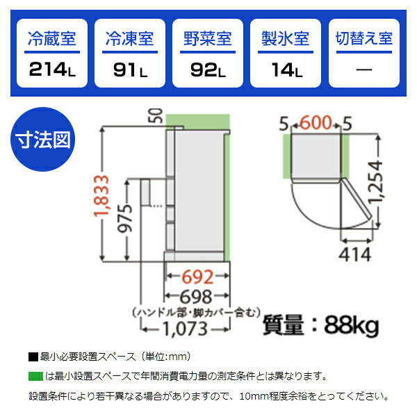 スペック* 定格内容積:411L* 各室容量…・冷蔵室:214L [169L うちチルドルーム 17L]・野菜室:92L [56L]・製氷室:14L [4L]・冷凍室(上段):20L [9L]・冷凍室(下段):71L [46L]※[ ]内の数字は食品収納スペースの目安* 自動製氷:有* 外形寸法:幅600×奥行692×高さ1833mm* 必要設置スペース:幅610×奥行698×高さ1883mm※設置条件により若干異なることがありますので、10mm程度余裕をとってください。